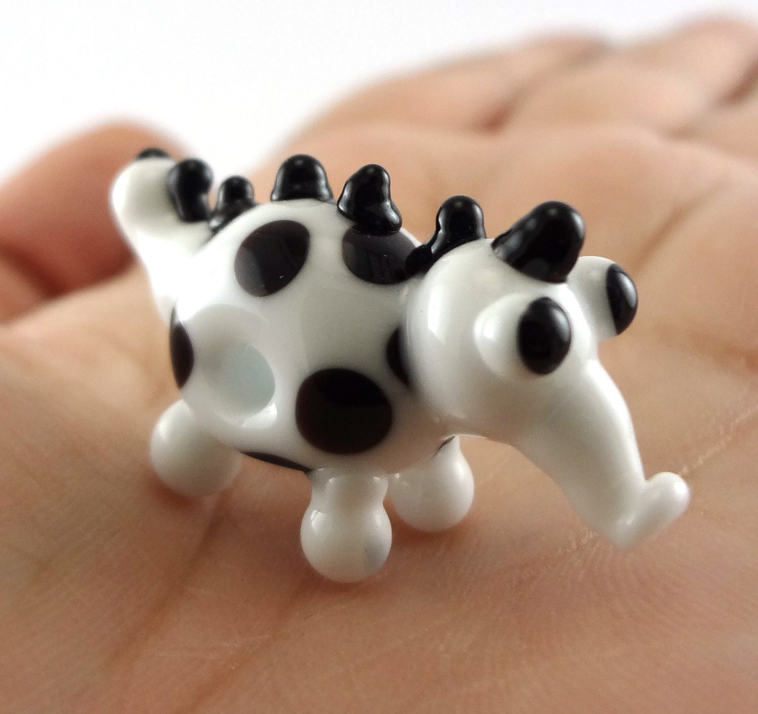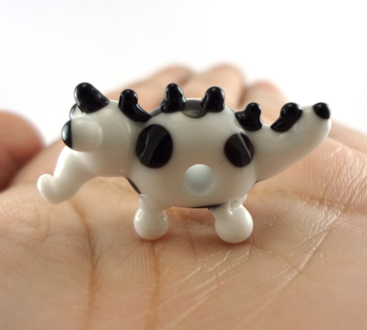 Little glass monster made with white opaque glass with black polka dots and spikes along his back. Measures about 18mm tall and 32mm long.