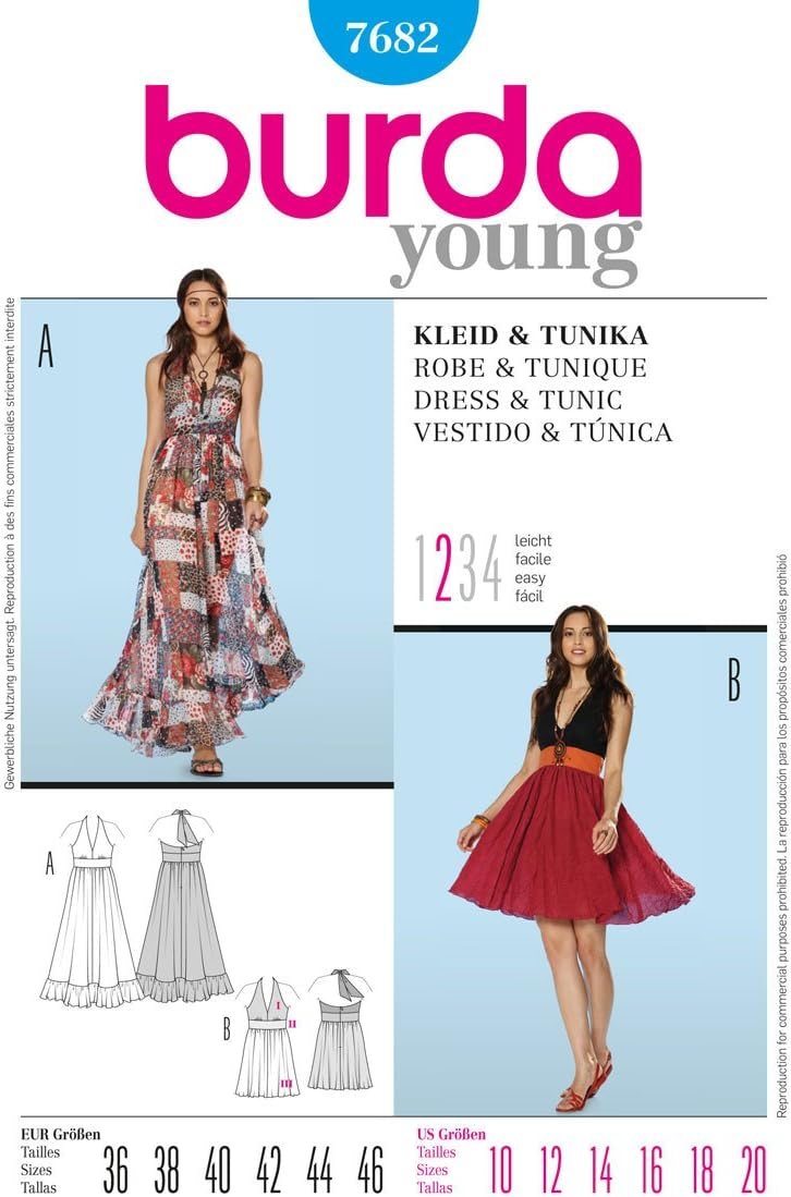 Summer vibes: Backless dress with plenty of swing. Model A is long with a border ruffle. Dress B is short and combined with three different fabrics.