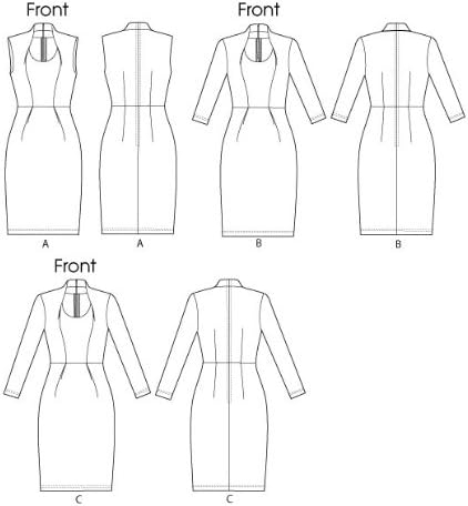 Misses’/misses’ petite dress: fitted dress (close-fitting through bust) has side front bodice extending into back collar, front pleated skirt, stitched hems and back zipper. Designed for two-way stretch knits. Fabrics: rayon/spandex, cotton/spandex. Unsuitable for obvious diagonals. with nap. Notions: 22-inch zipper, one hook & eye, 1/4-inch shoulder pads. Combinations: a5(6-8-10-12-14),e5(14-16-18-20-22)