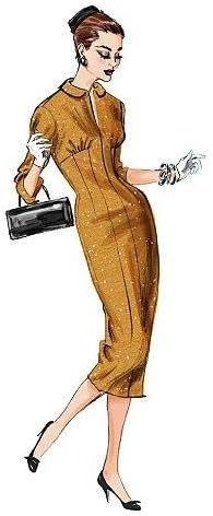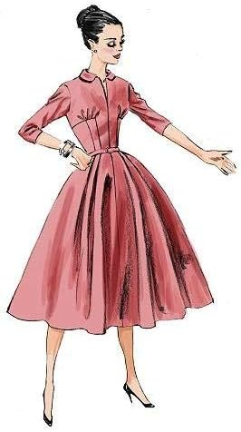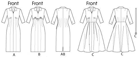 MISSES’ DRESS: Fitted (through bust), lined dress has front princess seams, left side extension and side snap or zipper closing. B: Front band extends into tie ends. A, B: Semi-fitted through hips, back slit. C: Front pleated skirt and self belt. Designed for lightweight woven fabrics. FABRICS: Taffetas, Gabardines, Woolen Blends, Linens. NOTIONS: A, B, C: Nine 2 Snaps and One Hook and Eye or One 14″ Zipper. Belt C: One 1″ Slide Buckle. Combinations: A5 (6-8-10-12-14), E5 (14-16-18-20-22).