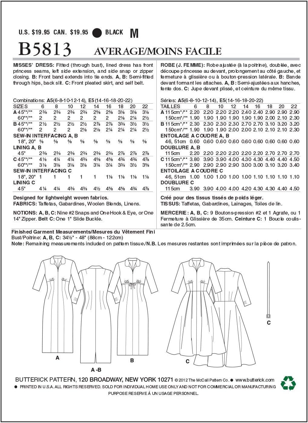 BUTTERICK PATTERNS B5813 Misses’ Dress, Size A5 (6-8-10-12-14)