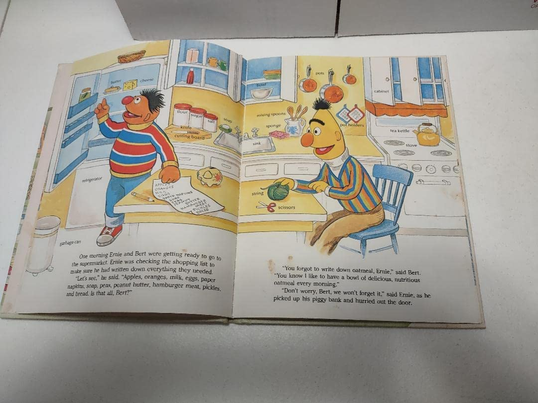 Bert and Ernie figure out a way to remember all of the items they need from the supermarket. Includes labeled panoramas of a kitchen and a supermarket.