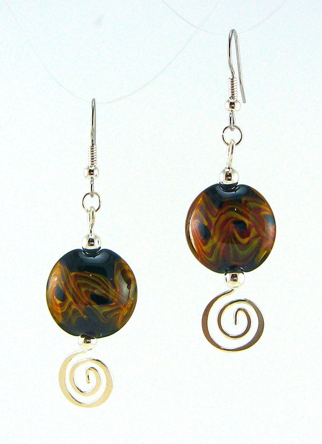 Lampworked italian glass beads made with red, orange, and yellow ribbon stringer (also made by me) applied over black glass in swirls and shaped into lentils. You have to see these beads in person to fully appreciate the depth created by combining transparent and opaque colors in the stringer. The beads are then thinly encased in clear glass to enhance the colors and create even more depth. The beads are about 17mm across and about 11mm thick. Completed with silver plated beads, spiral headpins, and surgical steel earwires.