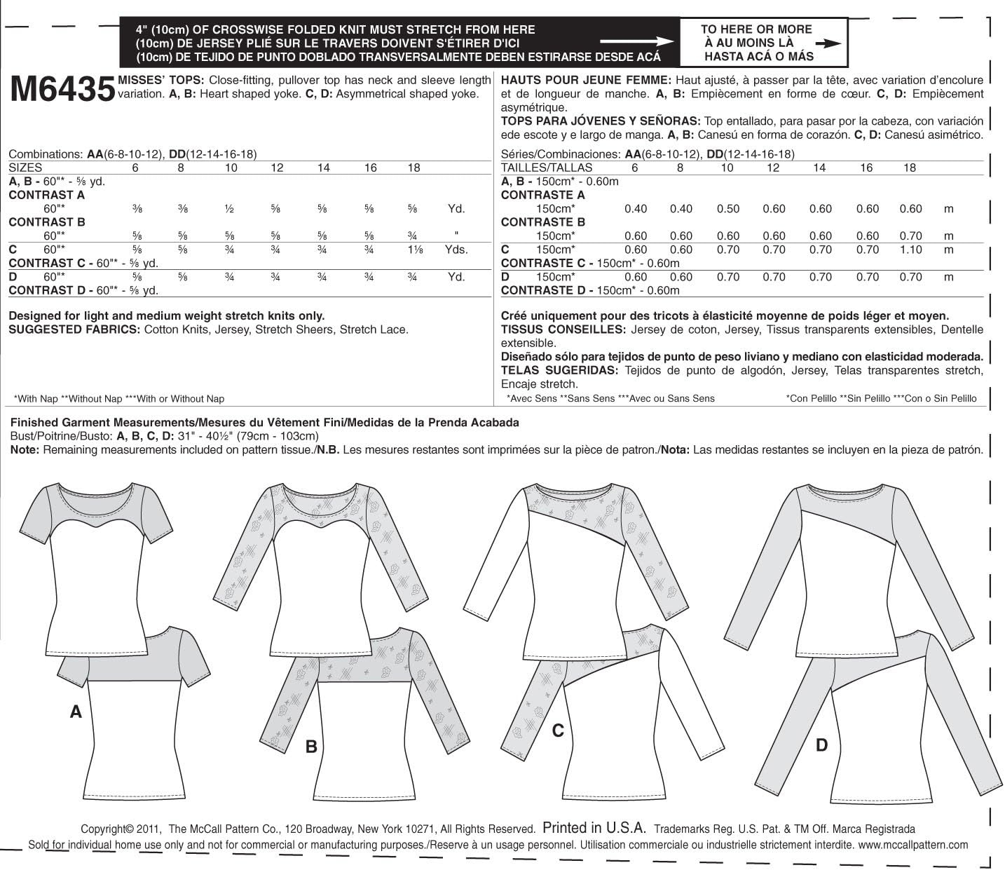 McCall Patterns M6435 Misses’ Tops, Size AA (6-8-10-12)