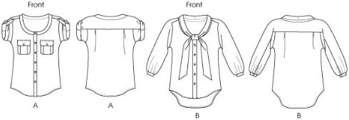 Misses’ blouses: loose-fitting blouses have neck/front bands, yoke and front sleeve (cut on crosswise grain of fabric), no shoulder seams, back pleats and narrow hem. A: pleated pockets with button flaps and short sleeves rolled-up (wrongside shows) with button tab. B: bias collar extends into tie ends and sleeves gathered into button cuffs with seam opening. Designed for lightweight wovens. Suggested fabrics: chiffon, georgette, challis, voile. Notions: a: ten 1/2″ buttons. B: eight 1/2″ buttons. with nap without nap with or without nap combinations: ax5(4-6-8-10-12), dd(12-14-16-18).