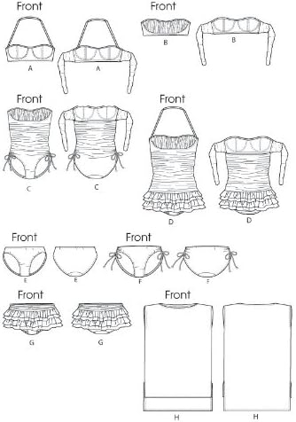 Misses’ tops, swimsuits, bikinis and cover-up: close-fitting, lined tops and swimsuits have bra, boning, bands (inside c and d), elasticized tie ends and bias binding. A and d: straps. C and d: gathered bra/elastic side seams. Lined bikinis have elastic waist. C and f: drawstrings. G: drape. D and g: yokes and ruffles (optional very narrow hems). C, d, e, f and g: elastic leg openings. All are cut on crosswise grain of fabric. A/b, c, d cup sizes. Pullover cover-up has uneven hemline (wrong side shows), side slits and narrow hem. Designed for two-way stretch knits; and for h: lightweight wovens. Suggested fabrics: a,b,c,d,e,f,g: swimwear knits, lining: swimwear knits, swimwear lining; h: chiffon, georgette, cotton voile. Interfacing a,b,c,d: polylaminate foam. Notions: a,b,c,d: 3/8 yd. Of 1/4-inch swimwear featherlite boning. A,b: 23/4 yds of 3/8-inch swimwear elastic. C,d: 5 yds. Of 3/8-inch swimwear elastic. D: 1 pkg. Of 1/4-inch clear elastic. E,f,g: 21/2 yds. Of 3/8-inch swimwear elastic.with nap without nap with or without nap combinations: a by 5(4-6-8-10-12), d5(12-14-16-18-20)