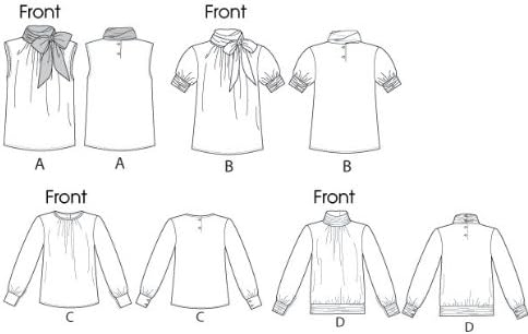 Misses’ tops: loose-fitting, pullover tops have gathered front neckline and back-button placket. a: purchased bias tape finishes armholes. b: sleeve bands. a, b: bias collar extends into tie ends. c: bias neck binding. a, b, c: narrow hem. d: collar, lower edge gathered into band. b, c, d: gathered sleeves. b, d: bias, gathered overlays. c, d: button cuffs, seam opening on sleeves. designed for light to medium weight woven fabrics. suggested fabrics: carmeuse, crepe de chine, challis, cotton voile. notions: a, b: two 3/8-Inch buttons. a: one pkg. of 1/2-Inch single fold bias tape. c: six 3/8-Inch buttons. d: eight 3/8-Inch buttons. with nap/without nap, with or without nap combinations: ax5(4-6-8-10-12), d5(12-14-16-18-20).