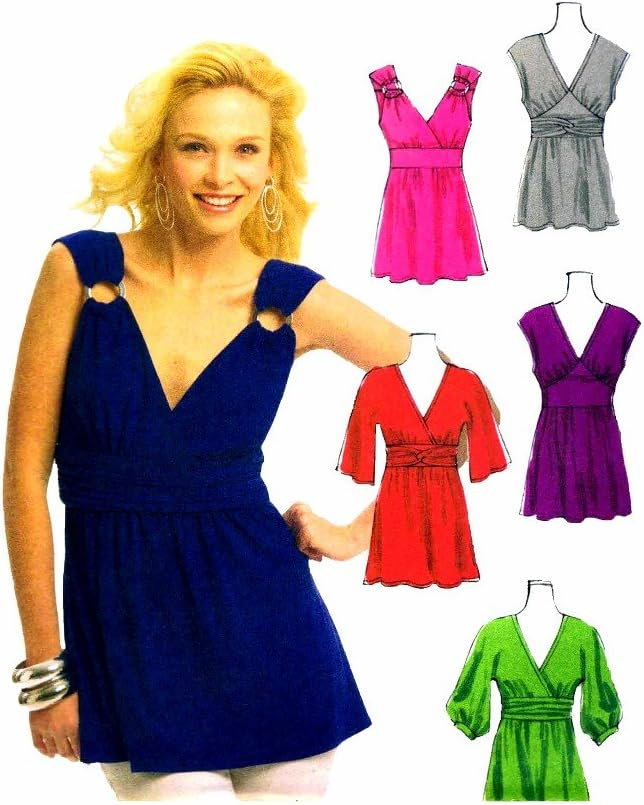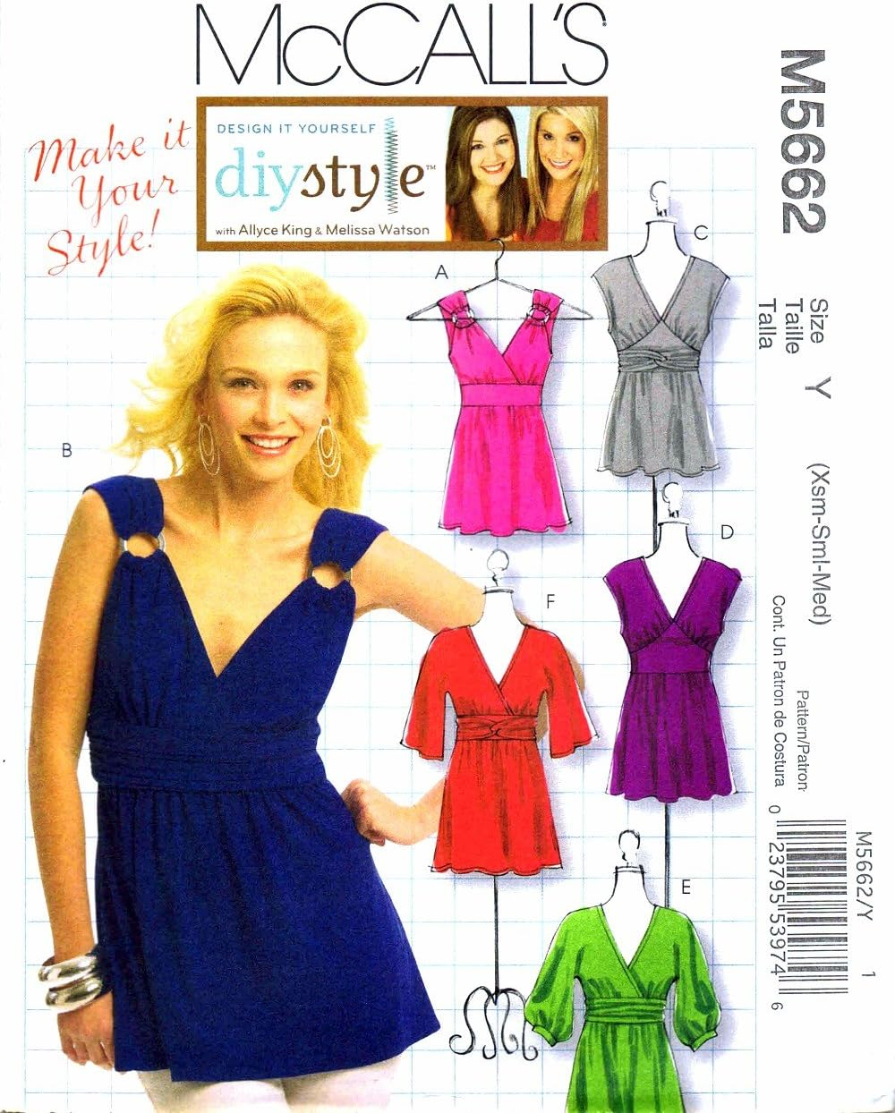 Uncut, factory folded pattern out of print pattern from 2008. Listed on the McCall’s web site for $15.95. Design it Yourself DIY Style with Allyce King and Melissa Watson Sizes Xsm, Sml, Med Make it Your Style! Misses’ Tops, Tunics and Dress: Tunics A, D, tops B, C, E and dress F has self-faced middle sections and bodice variations; tunic A, top B has self-lined close-fitting upper front and purchased rings; tops B, E have gathered, draped middle section; top C, dress F have looped overlay; top E has three-quarter length sleeves gathered into cuffs; dress F has three-quarter length kimono sleeves.