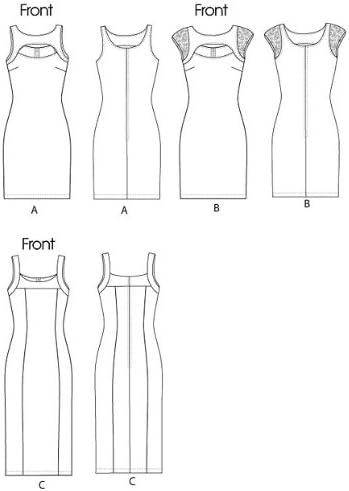 MISSES’/MISS PETITE DRESSES IN TWO LENGTHS: Close-fitting. A/B, C, D cup sizes. SUGGESTED FABRICS: For Two-way Stretch Knits Only: Jersey, Spandex, Dancewear Knit. Contrast B: Stretch Lace. NOTIONS: A, B, C: One 16″ Zipper, Hook and Eye. FINISHED GARMENT MEASUREMENTS: Printed on Pattern Tissue. *With Nap **Without Nap ***With or Without Nap Combinations: AX5(4-6-8-10-12), DD(12-14-16-18)