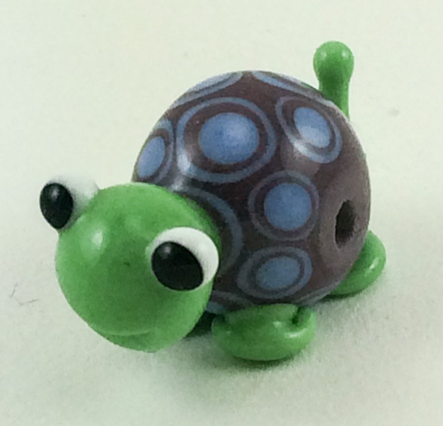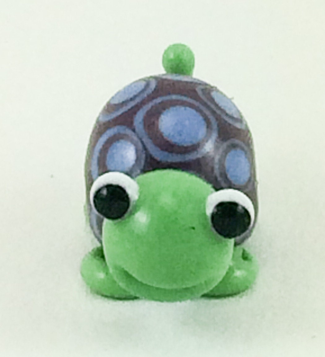 Little glass turtle figurine made with opaque green glass with a bullseye pattern shell in shades of purple and blue. Turtle has a smile on his face. Turtle measures about 1″ long.