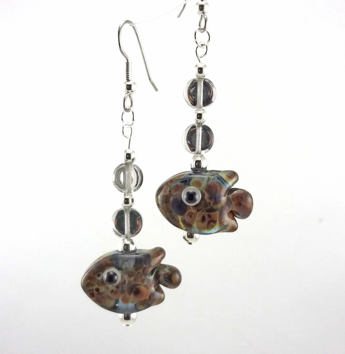 Transparent blue fish shaped, lampworked glass beads decorated with raku frit. The raku has been worked to bring out blues, greens, purples, magenta, oranges, and cream. Beads measure about 23mm from nose to tail. Earrings are completed with silver backed glass disk beads, silver plated beads, and surgical steel earwires.