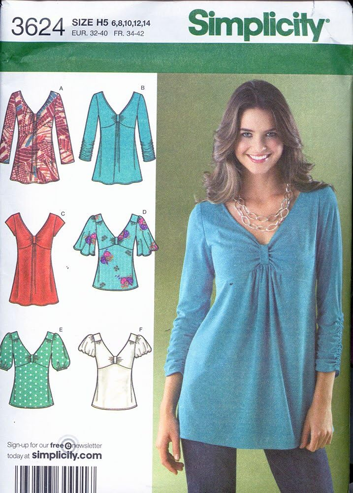 Simplicity 3624 Misses Knit and Woven Tops, Size H5 (6-14): Views A, B C are sized for stretch knits only including cotton interlock, jerseys, two-way stretch. Views D, E F are for woven fabrics such as laundered cottons, gauze, batiste, chiffon, georgette. All tops have an empire style bodice, gathered at center front. Options are included for sleeve style, sleeve length and top length.