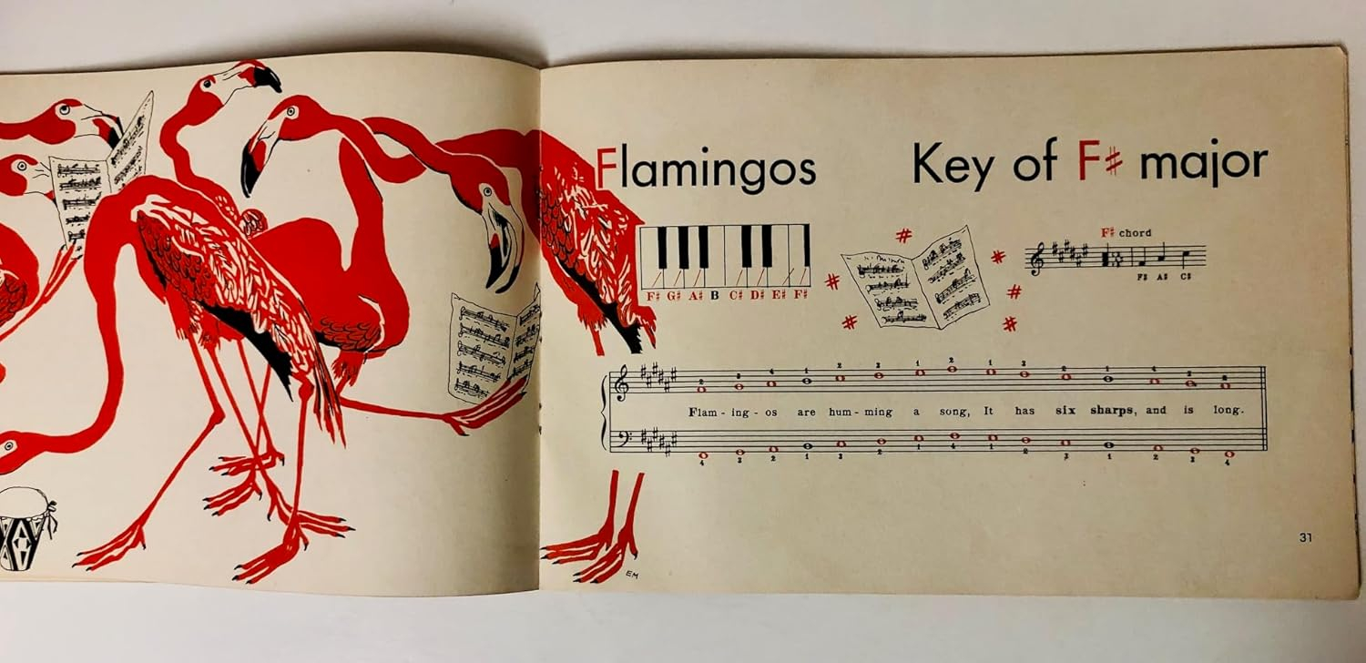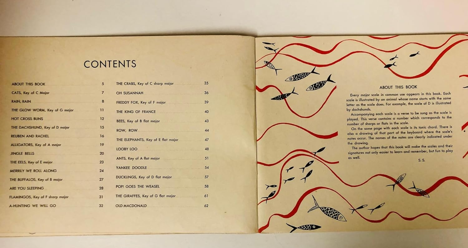“Every major scale in common use appears in this book. Each scale is illustrated by an animal whose name starts with the same letter as the scale does…Accompanying each scale is a verse to be sung as the scale is played…On the same page with each scale is its tonic chord…”–page opposite Contents.