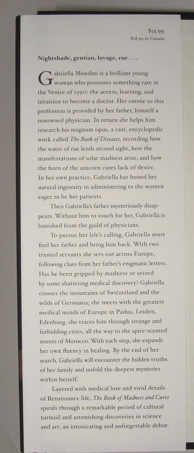 Sixteenth-century Renaissance woman and renowned physician Gabriella Mondini searches across Europe for her missing father, without whom she can no longer continue to treat her Venetian patients, who need her desperately.