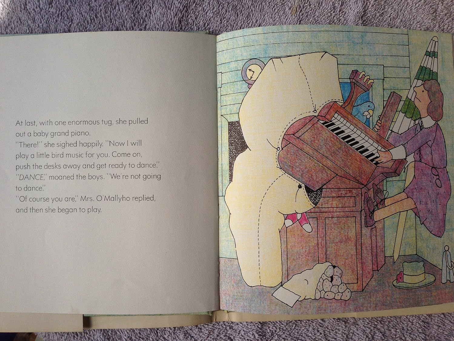 Before the regular teacher returns to her class, substitute Mrs. O’Mallyho pulls a baby grand piano from her bag and charms the children into dancing like birds, cats, hippos, and monsters.