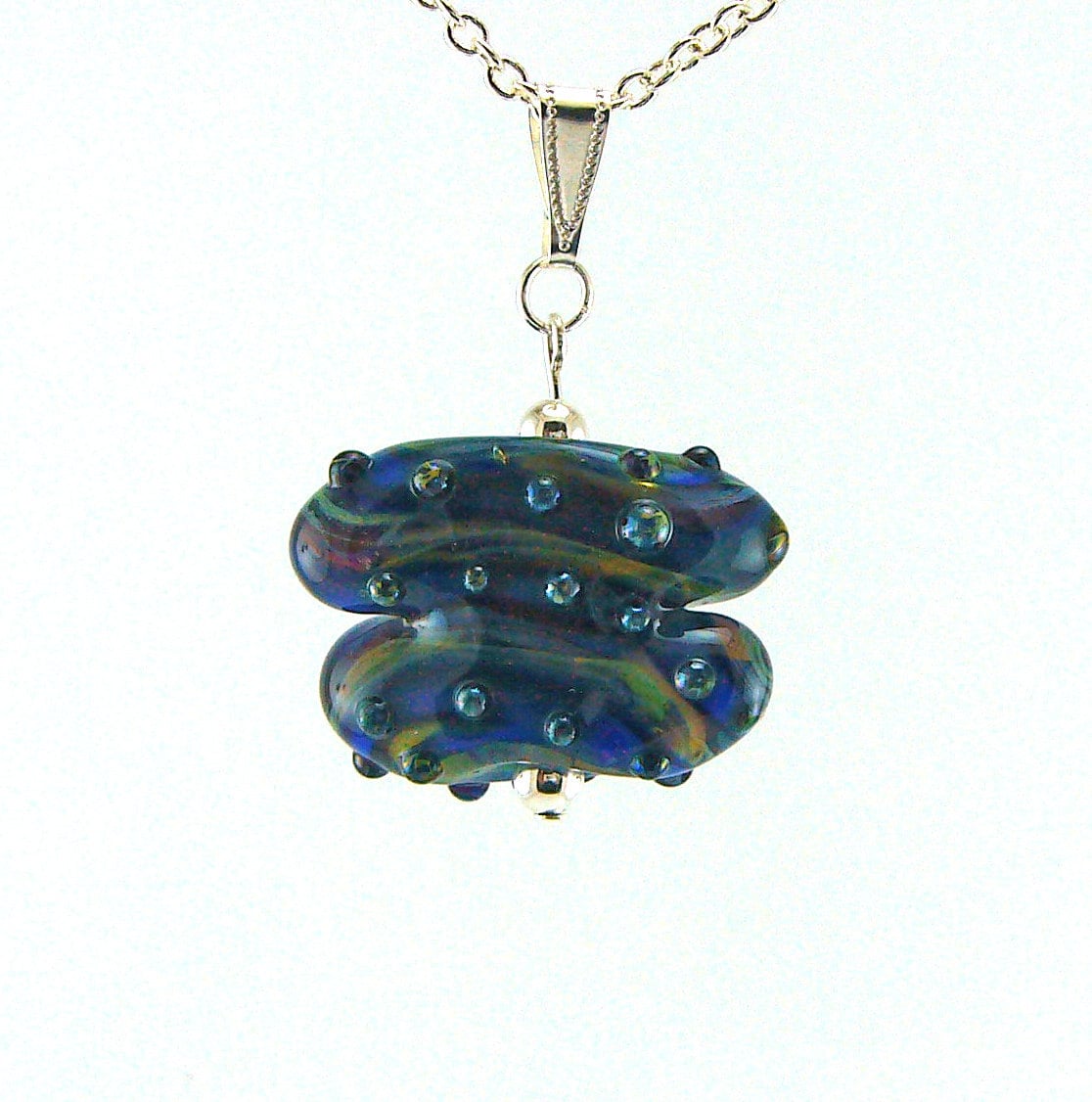 Thing shaped lampworked glass bead made with swirls of blue and clear glass as well as reactive silver glass which gives the bead a lovely shimmer. Dots of reactive silver glass are also added to the surface. Bead is about 26mm across, 23mm tall, and 8mm thick at its widest points. Completed with silver plated beads, and fine chain with a lobster clasp. The total length of the necklace is about 21″, but I’ll be glad to make it any length you like.