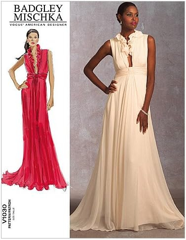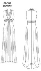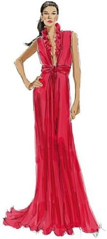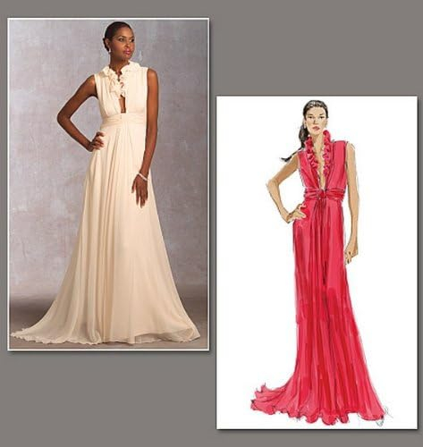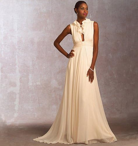 MISSES’ DRESS: Lined, flared, floor length dress (shaped hemline), close-fitting at bust, has back zipper, neck ruffle and bodice front extending to form neckline drape. Gathered drape is sewn over empire waist seam. NOTIONS: Dress: 20-Inch/22-Inch Invisible Zipper, Hooks and Eyes. FABRICS: Silk Chiffon and Crepe de Chine. Lining: Double Georgette. Unsuitable for obvious diagonals, plaids or stripes. Use nap yardages/layouts for pile, shaded or one-way design fabrics. With nap and without nap.
