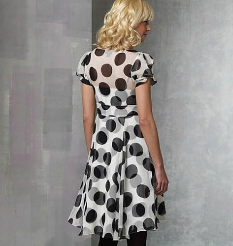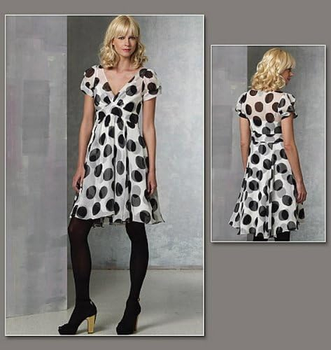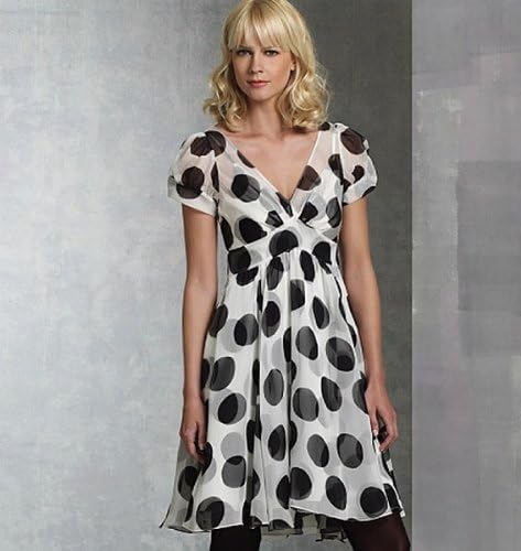 MISSES’ DRESS AND SLIP: Dress, above mid-knee (front), mid-knee (back), has fitted bodice, front pleats, midriff, flared skirt with side front and side back seams, side zipper and short, two-piece sleeves with mock bands. Bias, flared, pullover slip, above mid-knee, has shoulder straps, front darts and raised waist. NOTIONS: Dress: 7-Inch/9-Inch Invisible Zipper and Two 1/4-Inch Snaps. FABRICS: Dress: Chiffon and Georgette. Slip: Silk Twill and Charmeuse. Unsuitable for obvious diagonals, plaids or stripes. Use nap yardages/layouts for pile, shaded or one-way design fabrics. Slip: Unsuitable for one-way design. With nap and without nap.