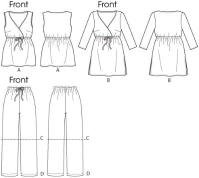 Misses tunic, shorts and pants: loose-fitting, pullover tunic has slightly blouson, mock wrap, bias, seamed upper front, side slits and narrow hem. Purchased bias tape finishes neckline, and armholes a. Semi-fitted, straight-legged shorts or pants have side pockets and stitched hems. All have tie ends with elastic. Fabrics: lightweight broadcloth, lightweight linen and lightweight crepe. Unsuitable for obvious diagonals. With nap. Without nap. Notions: a,b: 11/4 yds. Of 1/2-inch elastic and one pkg. Of 1/2-inch single fold bias tape. C,d: 11/4 yds. Of 1/2-inch elastic. Combinations: a5(6-8-10-12-14),e5(14-16-18-20-22)