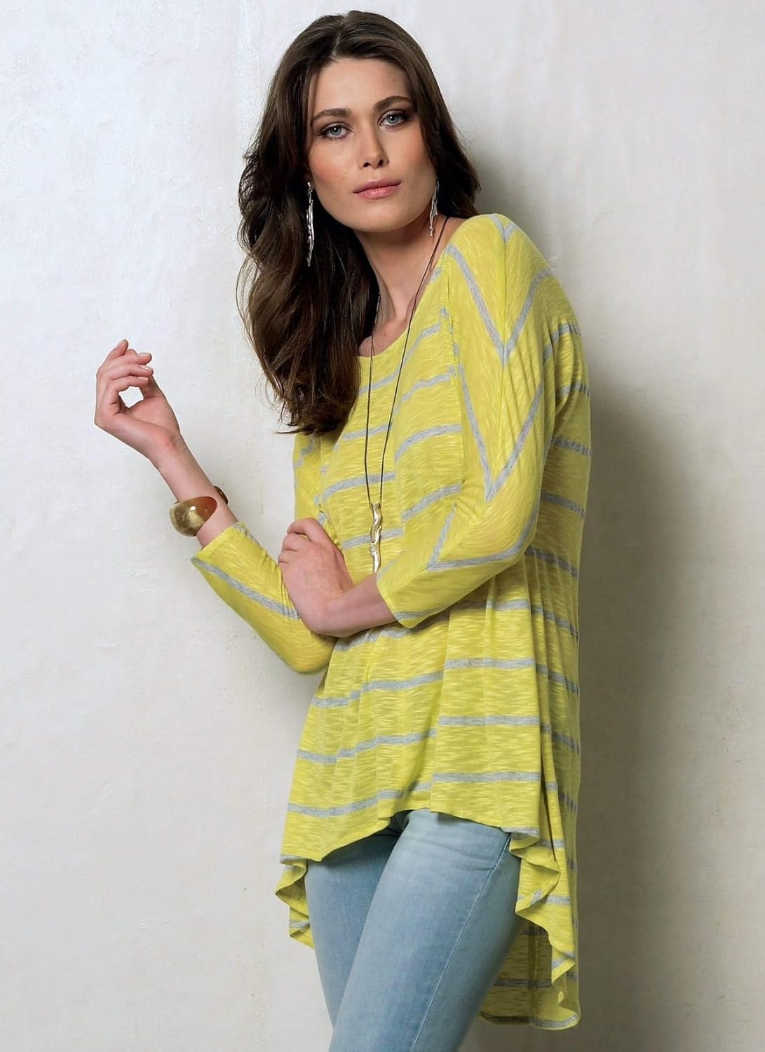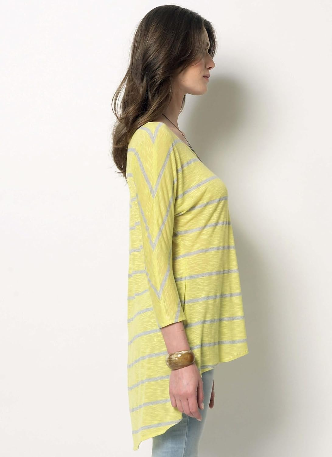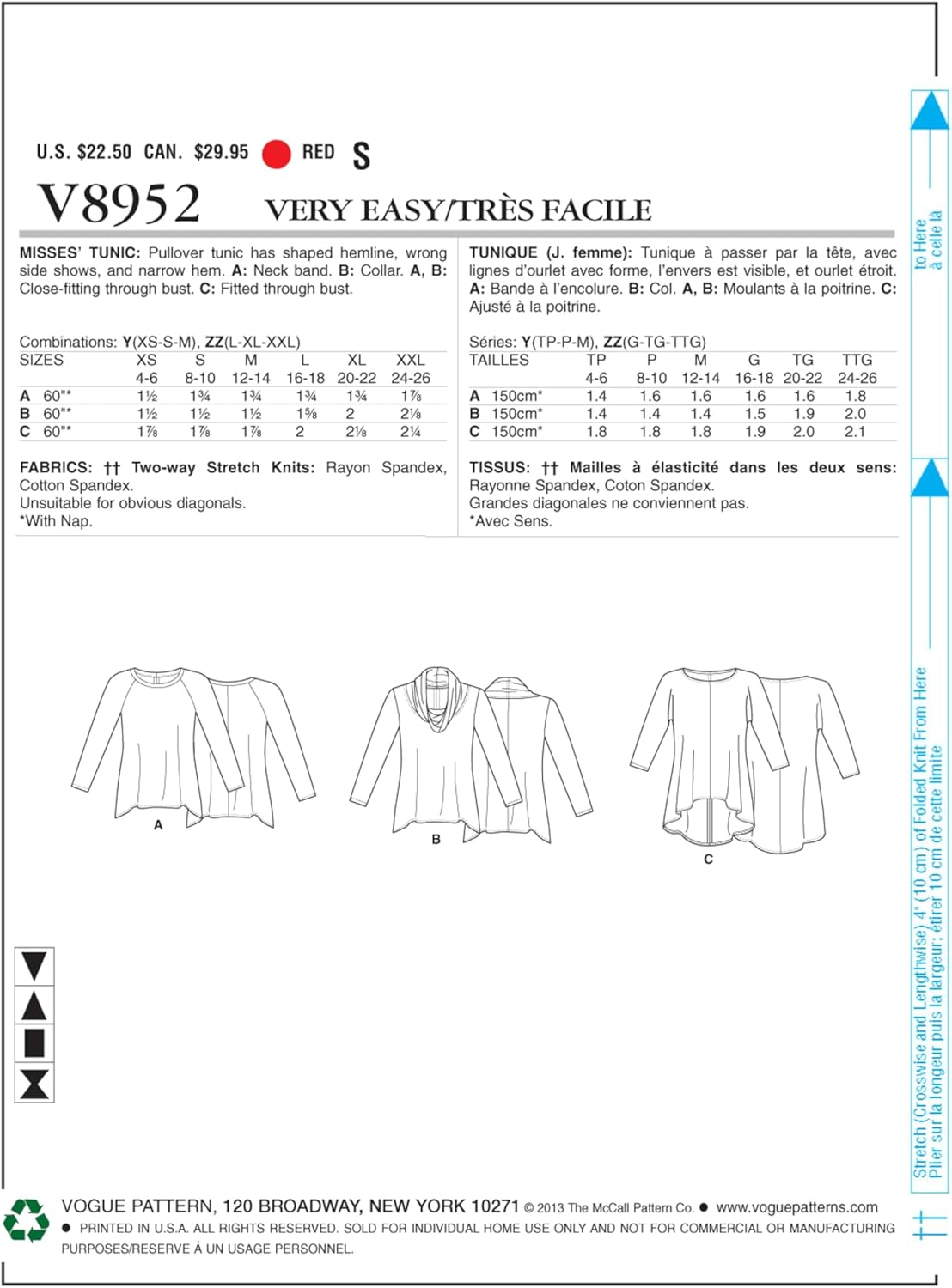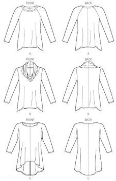MISSES’ TUNIC: Pull-over tunic has shaped hemline, wrong side shows and narrow hem. A: neck band. B: collar. A and B: close-fitting through bust. C: fitted through bust. FABRICS: Two-Way Stretch Knits: Rayon/Spandex, Cotton/Spandex. Unsuitable for obvious diagonals. With Nap. Combinations: Y(X-Small-Small-Medium), ZZ(Large-X-Large-XX-Large).